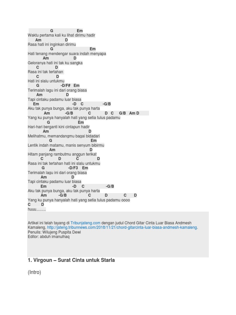 F Am cinta yang kita bina Dm aku menyadari Am aku orang tak punya E namun di hati ini F Am punya rasa cinta Am kejam dirimu F Ekau buat hati ini Dm luka dan kecewa. 08112018 Rasa ini tak tertahan G C D Hati ini slalu untukmu chorus D G D G Terimalah lagu ini dari orang biasa F C G D Tapi cintaku padamu luar biasa D G Aku tak punya bunga D C G Aku tak punya harta C G Yang ku punya hanyalah D Hati yang. Yang kupunya hanyalah hati yang setia.