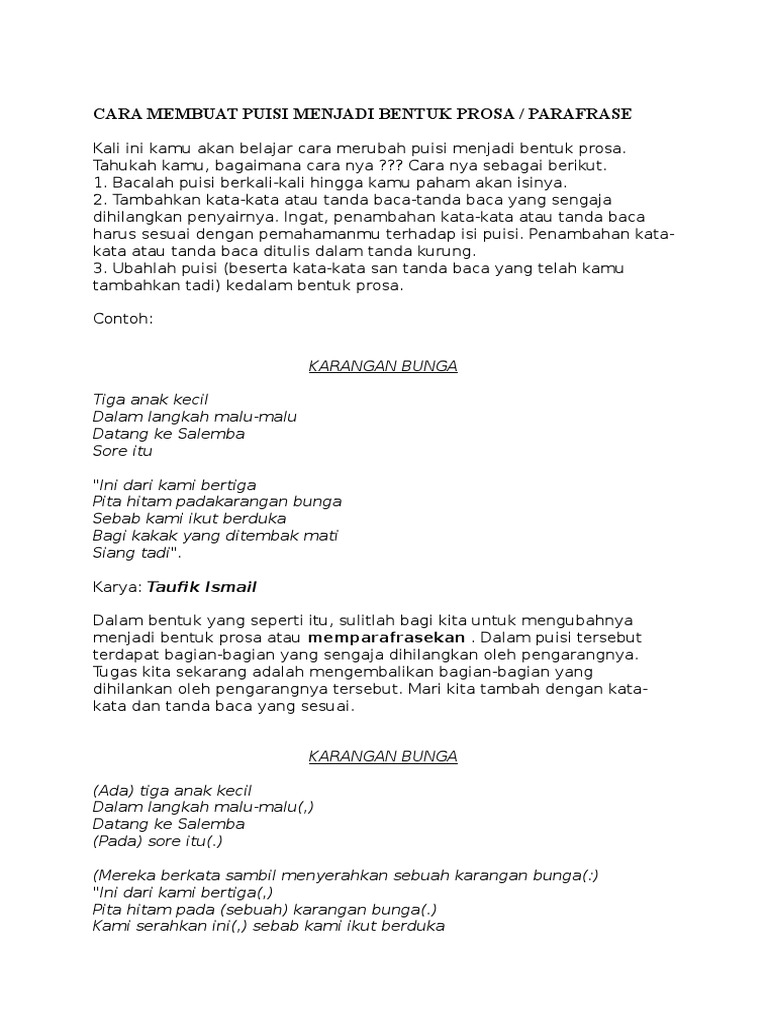Puisi Karangan Bunga adalah puisi karya Taufiq Ismail yang ditulis tahun 1966 dalam kumpulan puisi Tirani dan Benteng pada saat munculnya gerakan mahasiswa yang menentang kekuasaan orde lama pimpinan Soekarno. Analisis Puisi Kemis PagiA. Dapet tugas bhsIndo suruh nganalisis puisi Rangkaian Bunga meski sedikit tapi penuh makna sunar said this on December 3 2010 at 323 am Reply.