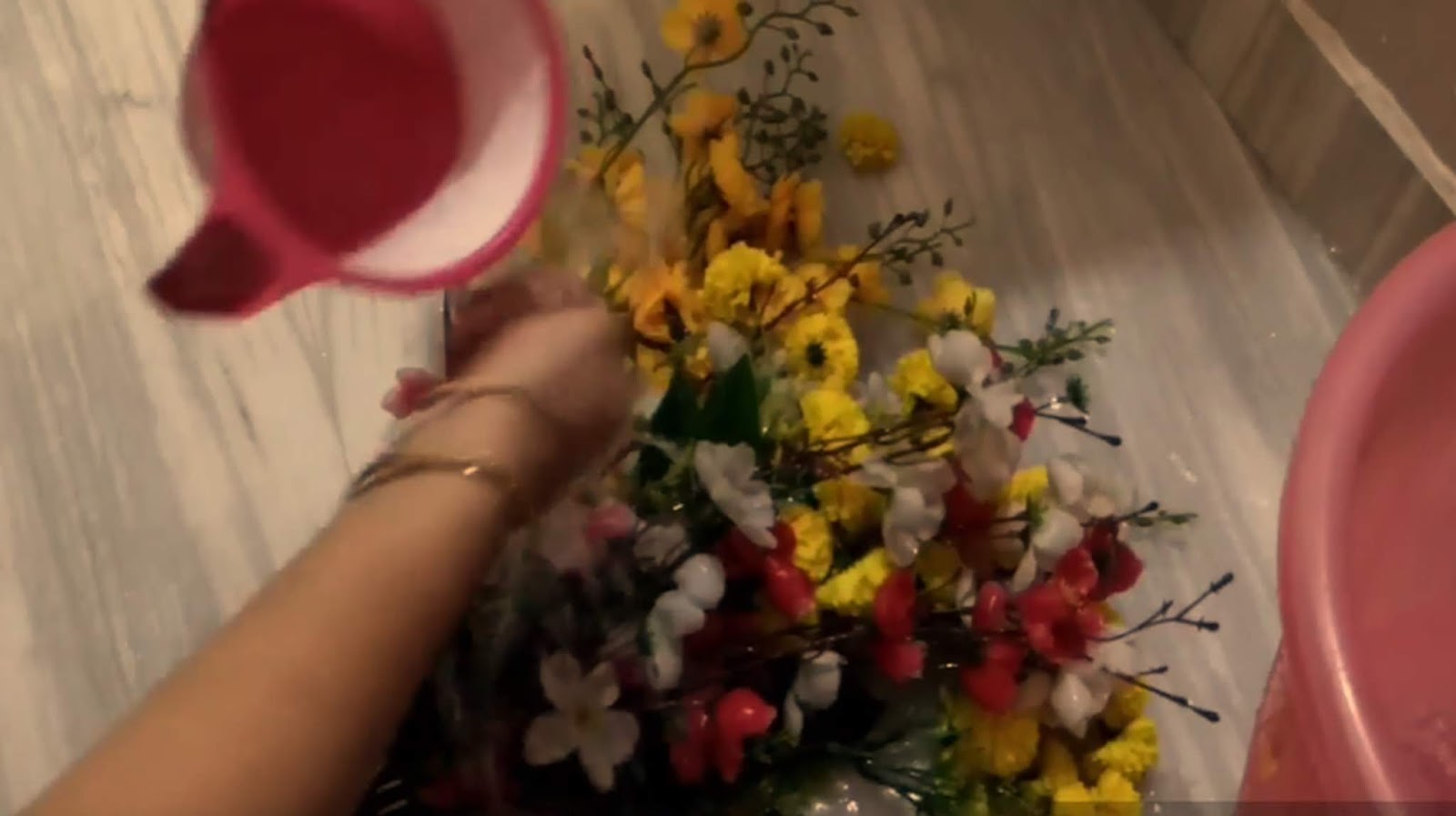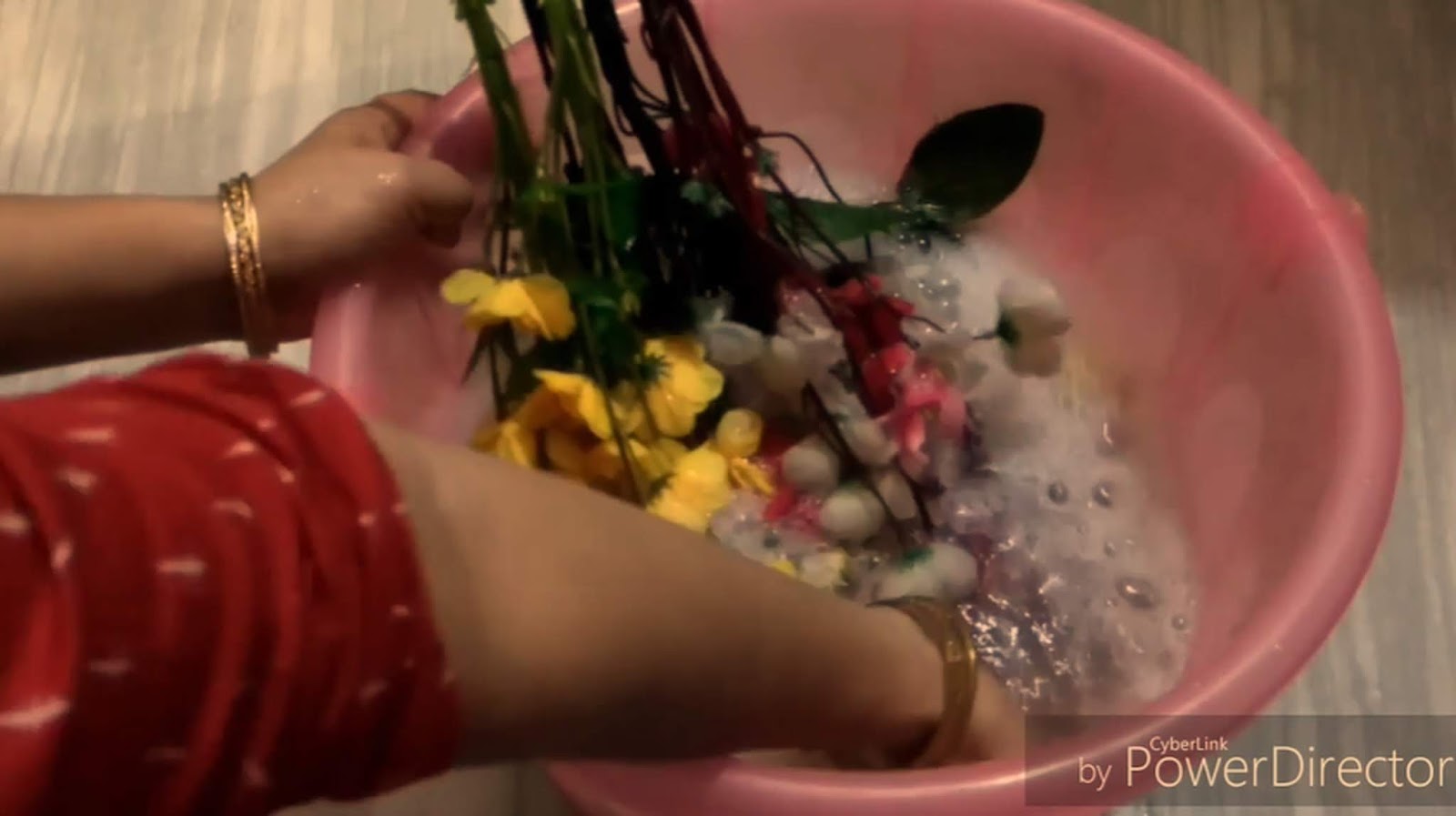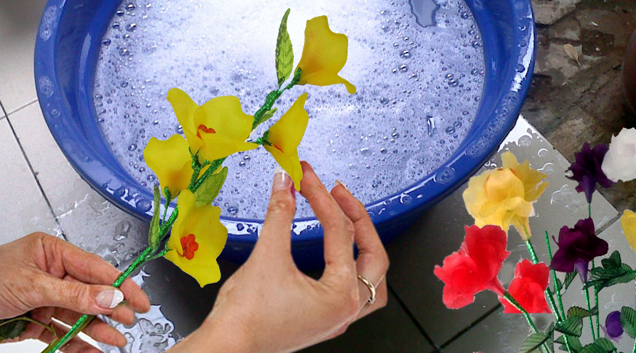 Cara membersihkan bunga plastik. Bersihkan debu di bunga setiap minggu. Masukkan bunga plastik ke dalam ember berisi air sabun dan goyang-goyangkan hingga debu menghilang. Jum 08032018 - 1017.