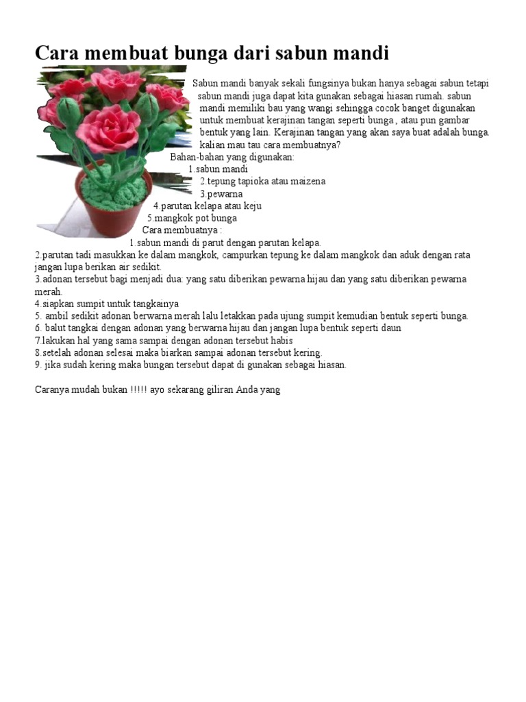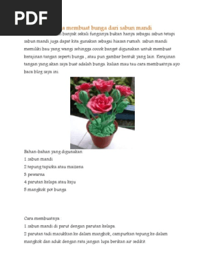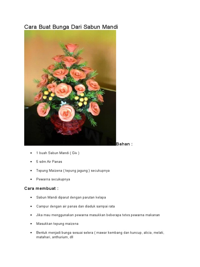 Berbagai info seputar contoh kerajinan bunga dari sabun mandi dan bunga lain nya. Cara membuat Clay Tepung Maizena. Sabun mandi memiliki bau yang wangi sehingga cocok banget digunakan untuk membuat kerajinan tangan seperti bunga atau pun gambar bentuk yang lain.