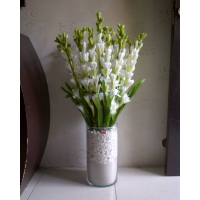 Agar tetap segar kamu perlu memotong tangkai bunga sedap malam sebelum memasukkannya ke dalam vas. Isi vas toples favorit Anda dengan 13 air. Bersihkan juga jika ada lendir yang menempel di bagian daun bunga.