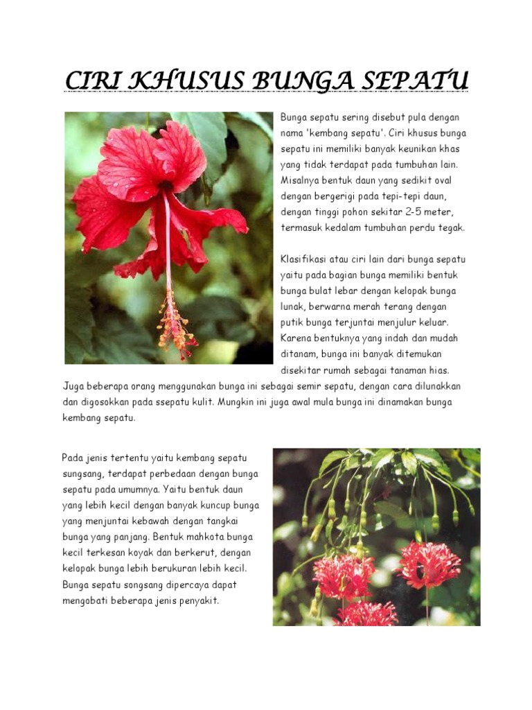 Ciri Khusus Bunga Sepatu dan Fungsinya Bunga sepatu adalah salah satu tanaman hias biasanya dapat tumbuh mencapai hingga 3 meter dan batangnya pun memiliki diameter kurang lebih 9 cm.