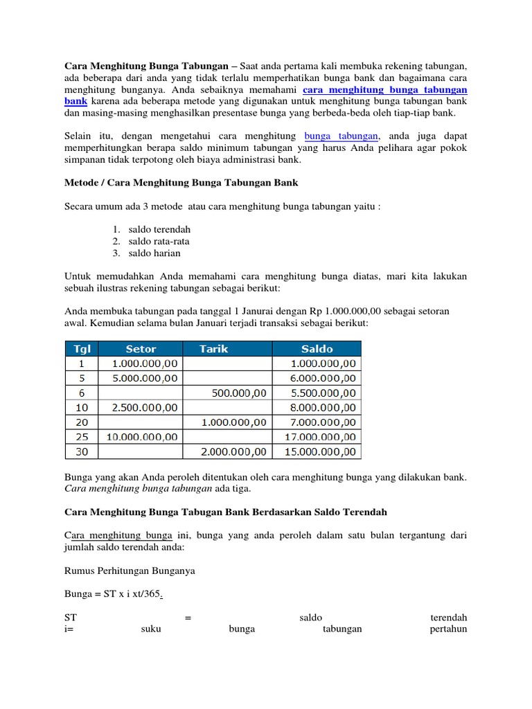 Bunga diperhitungkan dengan dasar lamanya saldo mengendap dan tingkat suku bunga berubah-ubah. Cara menghitung bunga tabungan di bank BCA BRI Mandiri dan lain-lain beserta dengan rumus tabel perhitungan dan contoh soalnya. Hal pertama yang dicari adalah bunga tabungan yang didapatkan oleh ali selama menabung.
