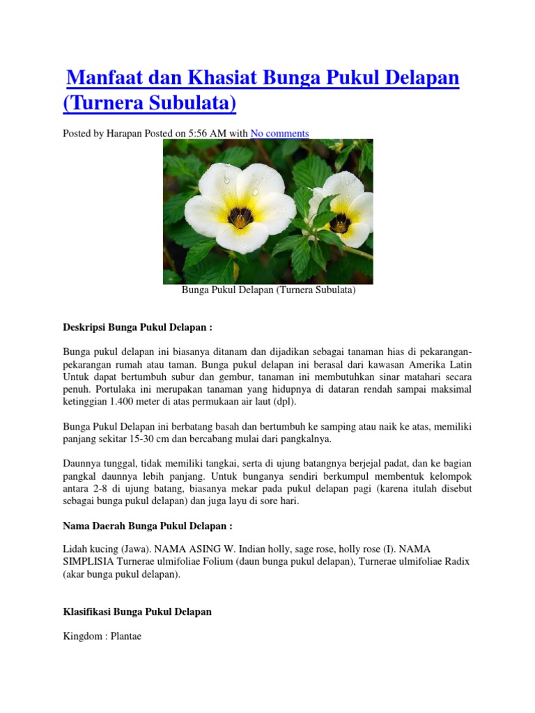 Bunga pukul delapan Turnera yang juga dikenal dengan nama lidah kucing adalah genus tumbuhan dari famili Passifloraceae yang berasal dari Meksiko dan Hindia Barat.