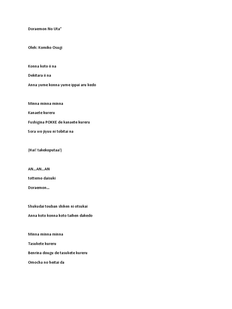 Doraemon Ending Indonesia Key. Lagu Doraemon Ending Versi Indonesia Lihat-lihatlah bunga Andai ku mekar Tiba saat mengucapkan selamat pagi Masa depan semua mari kita bangun. Lirik Lagu Doraemon Eding Lihat - lihatlah bunga Andai ku mekar Tiba saat mengucapkan selamat pagi Masa depan semua mari kita bangun Lalalala Lalalala Bernyanyi bersama Saya hidup di bumi ini Masa depan dengan kapal angkasa Mari kita banyak-banyak berhip riang Bermandikan satu-satu kita wujudkan Kita hidup di bumi ini Pagi ini esok Lanjut ke konten.