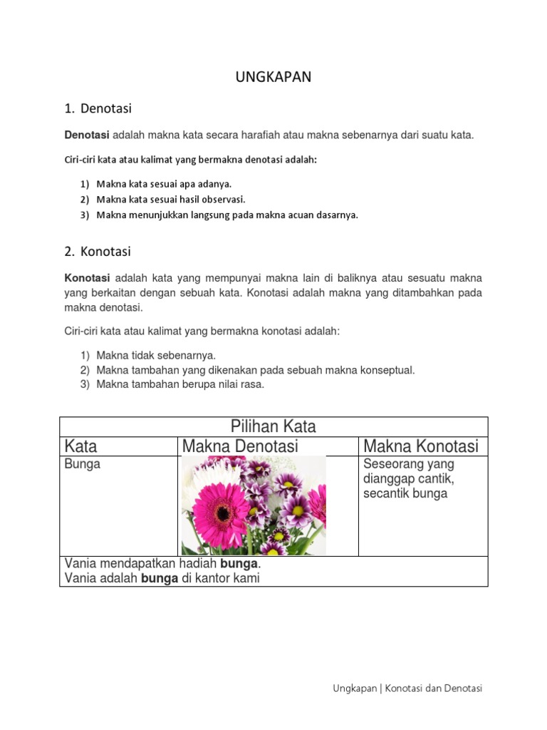 Makna denotasi dan konotasi dari kata bunga. Agar kita lebih memahami kedua makna kata itu berikut ditampilkan beberapa contoh keduanya yang. Sedangkan penelitian yang dilakukan sekarang meneliti makna konotatif dalam karya novel dan tidak mengaitkan dengan pembelajaran di SMA dan data dalam penelitian sekarang lebih. Makna Konotasi Makna konotasi adalah makna yang tidak sebenarnya atau makna yang tidak terdapat di dalam kamus.