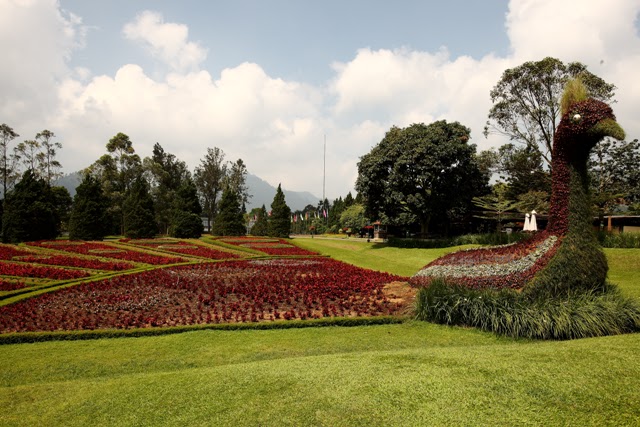 Patung merak taman bunga nusantara. Di Secret Labyrinth kamu bisa menjelajah semak-semak dan tanaman rambat yang menjulang sambil mencari jalan keluarSelain itu kamu bisa melihat burung merak yang sangat. Jika ingin berlibur ke Taman Bunga Nusantara jangan khawatir Anda akan kehabisan bahan untuk berfoto. Taman Bunga Nusantara adalah sebuah taman bunga seluas 23 hektar yang terletak di dekat Gunung Gede Pangrango dan Kebun Teh Bogor dengan jarak tempuh sekitar 2 jam perjalanan dari Jakarta.