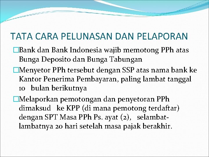 Tata cara pemotongan penyetoran dan pelaporan pajak atas bunga deposito adalah bank wajib memotong dan menyetorkan pajak penghasilan yang telah dipotong ke kantor Pos dan Giro atau bank persepsi dengan menggunakan surat setoran pajak setelah pajak dipotong dan disetorkan maka wajib dilaporkan ke Kantor Pelayanan Pajak paling lambat tanggal 20 bulan takwim. Login ke situs httpsdjponlinepajakgoid lakukan registrasi terlebih dahulu jika anda belum pernah mendaftar Klik E-Filing pada pojok kanan atas layar anda. 20 duapuluh persen dari jumlah bruto terhadap Wajib Pajak dalam negeri dan Bentuk Usaha Tetap BUT.