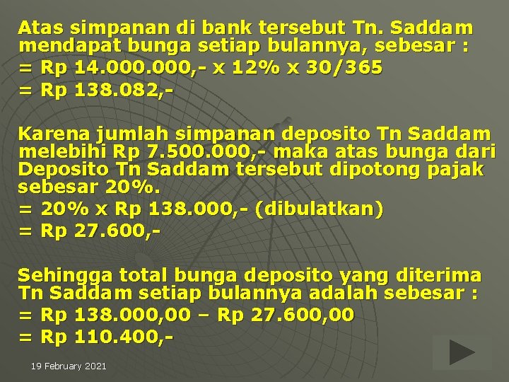 20 duapuluh persen dari jumlah bruto atau dengan tarif berdasarkan Perjanjian Penghindaran Pajak Berganda yang berlaku terhadap Wajib Pajak luar negeri. Salah satu objek dari pajak penghasilan final ini adalah bunga deposito dan tabungan nasabah. Sri Rahayu NIM.