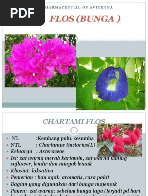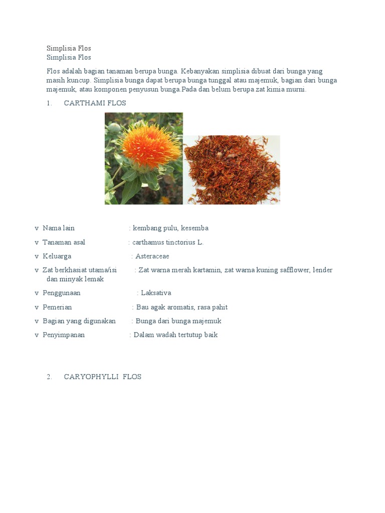 Simplisia bunga yang digunakan sebagai laktifuga dapat berasal dari tanaman. Cengkeh Tanaman asal. Formulasi sediaan pewarna bibir dari ekstrak bunga mawar yang dibuat stabil dan tidak menyebabkan iritasi saat digunakan. Dari sekian banyak tanaman obat ada salah satu tanaman yang berkasiat obat yaitu Impatien balsamina atau yang biasa disebut bunga pacar air ini telah diteliti bahawa kandungan fitokimia yang terkandung didalamnya dapat berkhasiat sebagai obat.