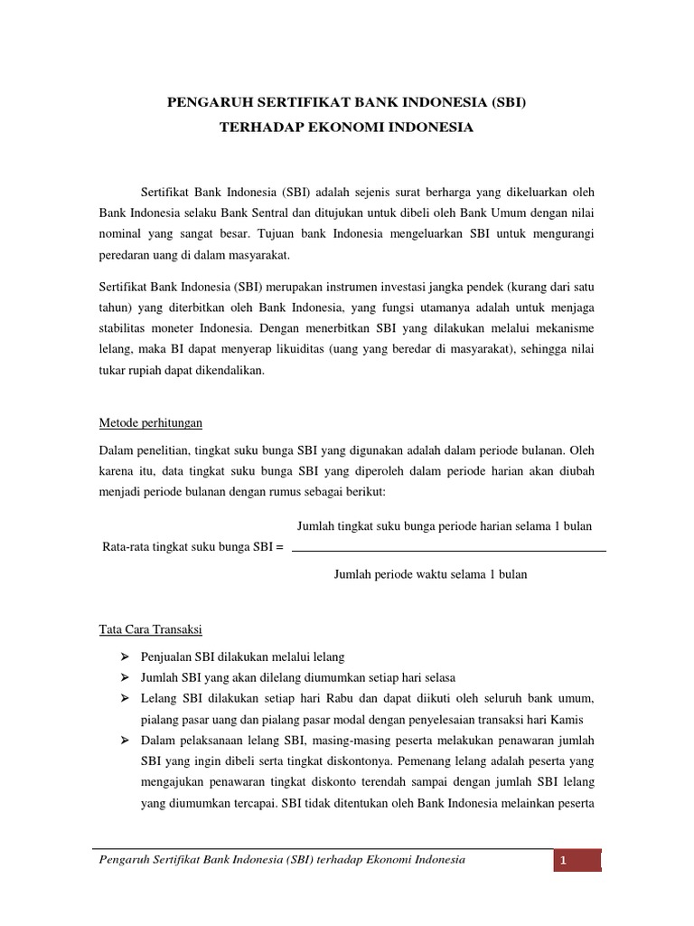 Sertifikat Bank Indonesia SBI adalah surat berharga yaitu dikeluarkan oleh Bank Indonesia sebagai pengakuan utang berjangka waktu pendek 1-3 bulan dengan sistem diskontobunga dengan tujuan untuk mengontrol jumlah uang beredar dalam masyarakat yang secara tidak langsung bisa mengendalikan laju inflasi dan juga nilai tukar rupiah. Jurnal Kebangsaan VolI No1 Januari 2012 ISSN. PENGARUH JUMLAH UANG BEREDAR JUB SUKU BUNGA SERTIFIKAT BANK INDONESIA SBI IMPOR EKSPOR TERHADAP KURS RUPIAH DOLLAR AMERIKA SERIKAT PERIODE JANUARI 2006 SAMPAI MARET 2010 SKRIPSI Untuk Memperoleh Gelar Sarjana Ekonomi pada Universitas Negeri Semarang Oleh Siti Aminah Ulfa NIM 7450407053 JURUSAN EKONOMI PEMBANGUNAN.