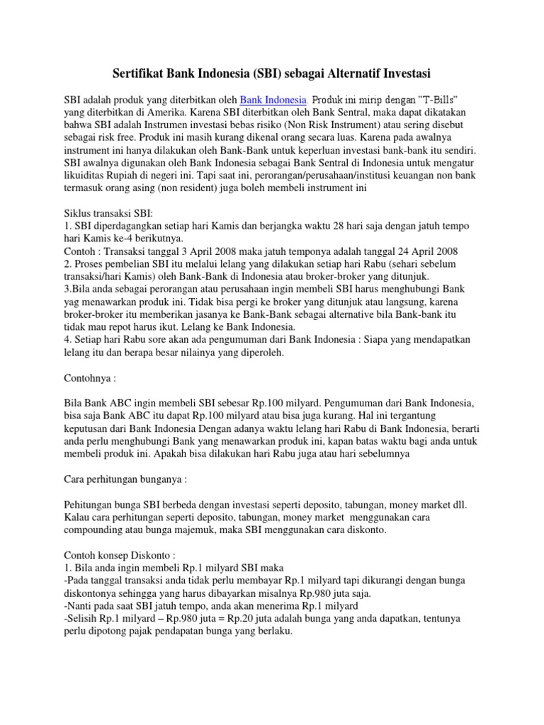 Produk tersebut menitik beratkan pada usaha untuk menghindari riba bersifat halal serta bermanfaat bagi umat. Sertifikat Bank Indonesia SBI merupakan salah satu instrumen hutang debt instrument karena aset ini mengharuskan penerbitnya melakukan pembayaran kembali dalam jumlah tertentu yang terdiri dari nilai pokok ditambah bungaTingkat suku bunga SBI ditentukan pada pelelangan di kantor pusat Bank Indonesia pada hari Rabu setiap minggunya. Bagi investor bunga deposito menguntungkan karena suku bunganya yang relatif lebih.