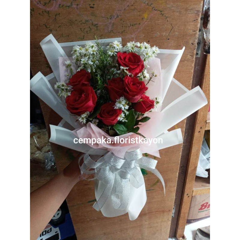 Seperti ulang tahun lulus wisuda ataupun berbagai perayaan lainnya. Kamu bisa menemukan penjual Buket Bunga dari seluruh Indonesia yang terdekat dari lokasi. Seperti Buket Bunga Mawar Merah dengan riasan bunga Peacock dalam balutan kertas kain pembungkus berwarna merah dan transparan serta ikat pita.