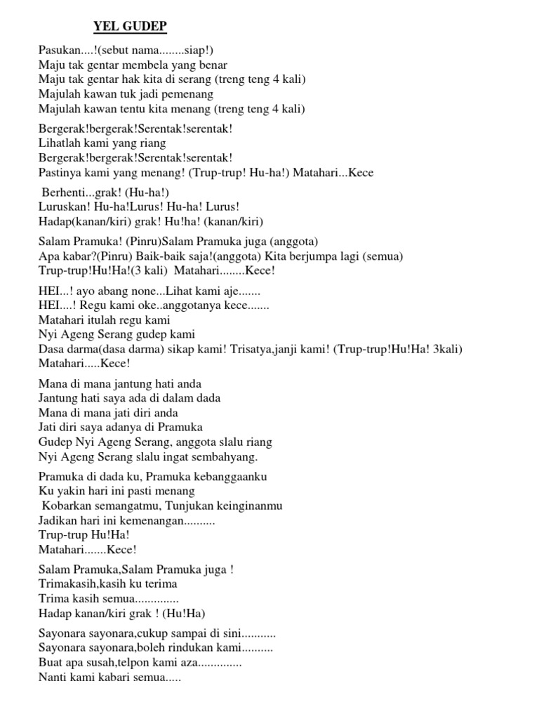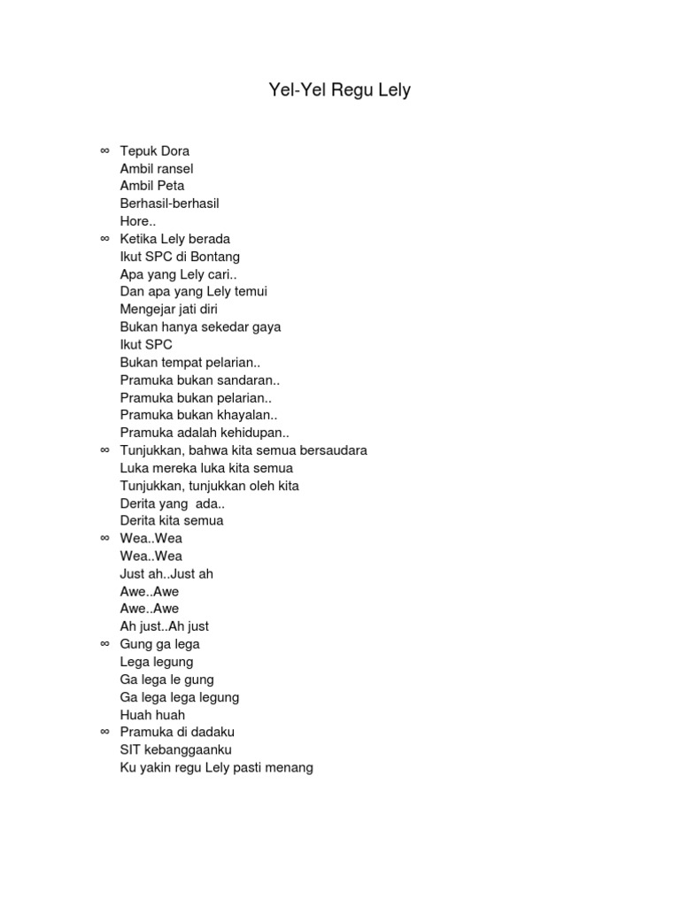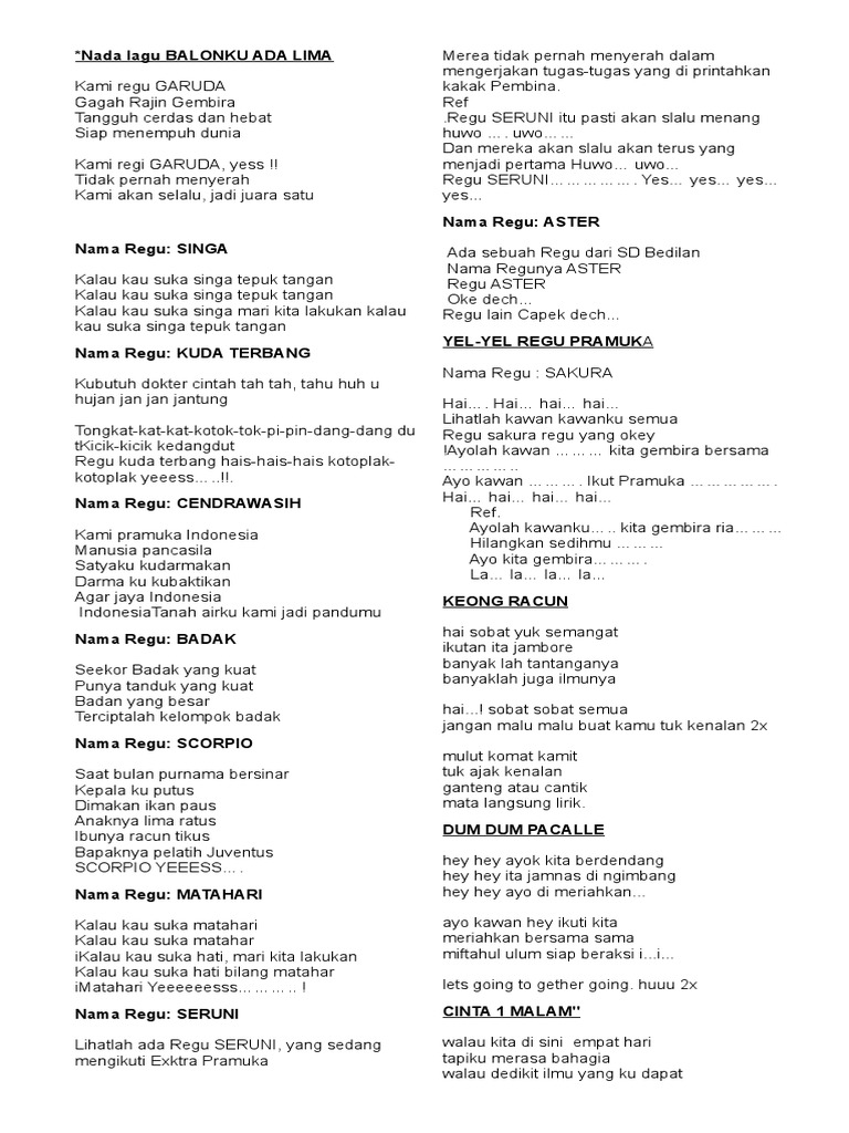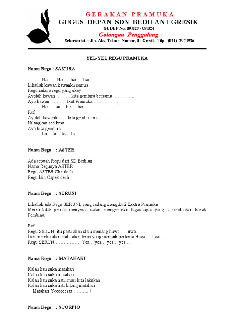 Share tweet Pin. Yel-yel dari regu matahari ini menggunakan nada lagu anak-anak pelangi-pelangi berikat lirik yel-yelnya. Istilah pramuka sendiri merupakan singkatan dari praja.